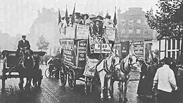 Emmeline Pankhurst had increasingly felt that the ILP was not there for women.[5] On 9 October 1903, she invited a group of ILP women to meet at her home the next day, telling them: "Women, we must do the work ourselves. We must have an independent women's movement. Come to my house tomorrow and we will arrange it!"[6] Membership of the WSPU was open to women only, and it had no party affiliation.[5]