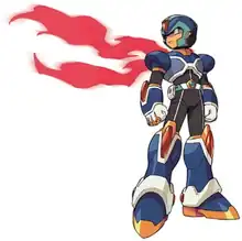 Inafune originally created the character Zero to be the game's main, playable protagonist.[45] Fearing a negative reaction from fans, Zero was ultimately reduced to a role secondary to X.[46][47] Inafune noted that in early sketches, X and Zero were too similar, so Capcom aimed to make their silhouettes contrast one another in order to make the merchandise easier to distinguish.[48] Early illustrations of X made him look like a "cold-blooded killer", which led artists to soften his features in later games.[49] Although there is some misconception regarding X's name since he is referred to as "Mega Man X" or "Rockman X" in some sources released before 2001, Inafune claimed that "X" is his true name.[50]