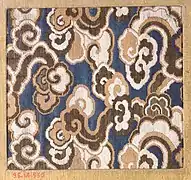 Xiangyun are one of the most auspicious patterns used in China and have a very long history.[5] Clouds motifs have appeared in China as early as the Shang dynasty and Eastern Zhou dynasty.[1][2][3]: 132 [6]: 25 They are one of the oldest decorations and ornaments used in Chinese art, Chinese architecture, furniture, and Chinese textile and Chinese clothing.[6]: 25 [7][2]: 579–582 When used on Chinese textile, xiangyun can take many various forms, including having the appearance of Chinese character wan (卐; wàn) or the appearance of the lingzhi.[2]: 582 [4][note 2] Xiangyun motif has been transmitted from generation to generation in China and is still valued in present days China for its aesthetic and cultural value.[5][7] Xiangyun was also introduced in Japan, where it became known as zuiun.[8]