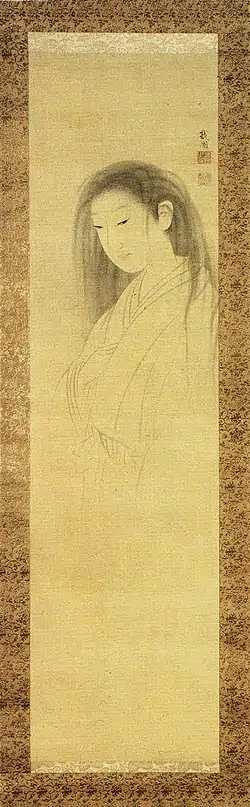 In the late 17th century, a game called Hyakumonogatari Kaidankai became popular,[5] and kaidan increasingly became a subject for theater, literature and other arts.[6] Ukiyo-e artist Maruyama Ōkyo created the first known example of the now-traditional yūrei, in his painting The Ghost of Oyuki.[7] The Zenshō-an in Tokyo houses the largest single collection of yūrei paintings which are only shown in August, the traditional month of the spirits.[8]