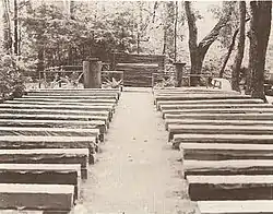 During the summer session, campers attend daily chapel services and a midweek colloquial Vespers service; however, most alumni of Camp Fitch would agree that the spiritual highlight of summer camping period is the unique Candlelight service held at the close of each week.[1][7][27] Authored by Raymond L. "Curly" Johnson, Fitch's director from 1928 to 1935, this service blends lessons of character building with Christian themes. Johnson originally conducted the service himself for campers, and the version used today has changed very little from its original form. At the end of the service, attendee's are tasked with setting a personal goal to work towards during his or her time away from Camp Fitch.[28] In 1982 to honor Johnson and his impact on Fitch's spiritual heritage, the camp chapel was renovated and renamed "Curly's Chapel".[7]