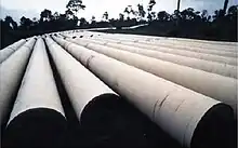 The gas field lies around 1,300 metres (4,300 ft) beneath the seabed in the water depth around 40 metres (130 ft). The offshore production complex consist of two remote wellhead platforms, one bridge-linked wellhead platform, a production platform, a living quarters platform, and a medium compression platform. Produced gas is exported through two pipelines. The first is the Yadana Gas Pipeline, a 409-kilometre-long (254 mi) pipeline runs 346 kilometres (215 mi) underwater from Yadana to Daminseik at the coast. From there, a 63-kilometre (39 mi) onshore section runs to the Thai border at Pilok. The onshore section crosses a region inhabited by the Karen, a minority ethnic group hostile to the government.[4] Construction of the pipeline was completed in 1998 and it cost US$1.2 billion.[5] This pipeline has capacity of 500 million cubic feet per day (14×10^6 m3/d).[3]