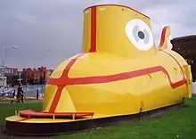 The Yellow Submarine in Liverpool is a large model representation of the submarine featured in the 1968 animated film Yellow Submarine, inspired by the 1966 song of the same name on The Beatles' album Revolver. It was built by a group of about 80 apprentices from Cammell Laird's shipyard, designed in part by Mr L Pinch, a draughtsman at the yard, for exhibition at the International Garden Festival in Liverpool in 1984.[1] The Submarine was in a garden themed around the Beatles, one of 60 such themed gardens, and was highly popular. The garden took the form of an apple-shaped labyrinth, containing symbolic references to the group, and included a bronze statue of John Lennon, which now stands at Liverpool John Lennon Airport.