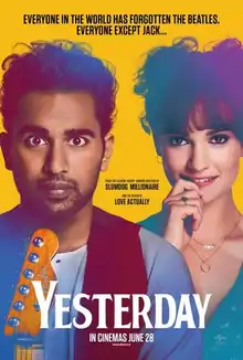 Yesterday is a 2019 musical romantic comedy film directed by Danny Boyle and written by Richard Curtis, based on a story by Jack Barth and Curtis. Himesh Patel stars as struggling musician Jack Malik who suddenly finds himself as the only person who remembers the Beatles and becomes famous for performing their songs. The film also stars Lily James, Joel Fry, Ed Sheeran, and Kate McKinnon.