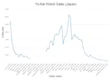 Yo-kai Watch debuted with a strong opening week, selling over 53,000 units in its first week of availability; the best selling handheld game in Japan and second-best selling game in Japan for that week, beaten only by Nintendo's 92,000 unit sales for Pikmin 3.[39] In a list published at the end of the year, Japanese video game magazine Famitsu named Yo-kai Watch as the 23rd best selling game in Japan, with just over 280,000 units sold.[40] After the debut of the Yo-kai Watch anime in January 2014, Level-5, a month later, reported that the sales numbers for the game had spiked to over 500,000 physical copies of the game sold alone, without including digital download sales.[41] The number was brought up to over 800,000, including digital sales, after sales tracker Media Create reported the game had sold as much by May 2015, though, Famitsu reported a more conservative estimate of 650,000 in the same time frame.[42] The month earlier, however, Level-5 reported that they had, in fact, shipped 1 million units,[43] with Level-5 CEO Akihiro Hino stating, in an interview with Famitsu, that he believed that the game would reach the million sales mark soon.[42] By June, a month before the release of the game's sequel, Yo-kai Watch 2, the game had crossed the million sales milestone, according to Media Create, after a steady increase of weekly sales since January 2014.[44] By November 2014, the game had sold a total of just under 1,294,000 units sold in Japan.[45] As of June 10, 2016, the game sold 400,000 units in North America. Although that number was below Level-5's expectations, it still got the Yo-kai Watch franchise off to a promising start overseas, and instilled confidence that the franchise would find its place.[46]
