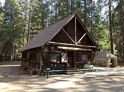 The 1-1/2 story log structure measures 23 feet (7.0 m) by 21 feet (6.4 m), with a prominent front porch, accented by a decorative log truss. The building is an example of the Rustic architecture as it was applied at Yosemite, with strips of cedar bark applied in a decorative pattern.[2]