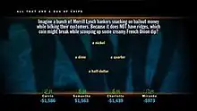 The game's trivia is based on general knowledge from several fields including science, history, and geography, combined with contemporary entertainment, celebrities, and other news items; the game, as well as the series, is often described as "high culture meets pop culture".[1] For example, one question asks the players to identify which Jennifer Aniston film title would most likely have been suited for a hypothetical romantic comedy penned by Albert Einstein about the interactions between neutrons and electrons, the answer being "He's Just Not That Into You".[2] In addition to the usual questions, each episode typically features a "DisOrDat" question. This question gives the players seven words or phrases which they have to identify as one of two possible classifications, or in some cases, both. For example, one DisOrDat series asks the players to identify terms that would be features of a Nexus One phone, Nexxus shampoo, or both.[3] In offline play, only one player plays, while other players try to steal money by getting the answer right if the main player gets it wrong. In online play, all players play the DisOrDat simultaneously. Players are also urged to look for the "Wrong Answer of the Game", which is hinted at by the show's sponsor; for example, in an episode sponsored by a baby crib company, the answer "Cat's Cradle" is the Wrong Answer of the Game. Choosing the correct Wrong Answer does not penalize the player but instead rewards them with a large monetary bonus.[3] Other questions are presented in the standard multiple choice format but use recurring concepts, such as questions based on a fortune cookie message, ones about a dream Cookie had based on a movie, or ones read through Cookie's ventriloquist dummy incorporating a speech impediment that may make the question harder to understand.[3]