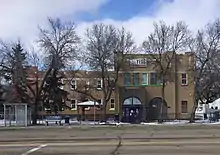 The YESS buildings are located at 9310 82 Avenue in Edmonton, including the main shelter, a gazebo, and several storage buildings.[8] The main building was built in 1905 as Edmonton Fire Hall No. 10 for the communities surrounding Mill Creek Ravine.[8] In 1926, the Salvation Army converted the fire hall into a shelter named Bonnie Doon Eventide Home, and in 1949, the main building became a single men's shelter.[8][9] Although Ken Lenz has stated that "the building was vacant for almost a decade beginning in the early 1970s," the Salvation Army did not actually sell the building until 1979, with YESS taking over the building in early 1980s.[10][11][12] In 1986, Edmonton company Rainbow Metal Products built eves, gutters, soffit, and fascia for YESS, whose buildings are now recognized for their Late Art Deco architectural style.[13]