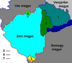 The formation of modern Zala County. (1) and (2) territories assigned from Zala County to Veszprém County in 1950. (2) territory reincorporated into Zala County in 1978. (3) territory assigned from Somogy County to Zala County in 1950. (4) territory assigned from Vas County to Zala County in 1950.