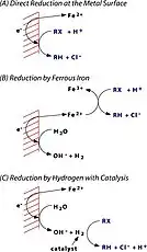 ZVI operates by electron transfer from Fe0 toward some organochlorine compounds, a common class of pollutants. The remediation process is proposed to generate Fe2+ and Cl− and halide-free organic products, all of which are relatively innocuous.[5] The technology is not however been implemented, despite many proofs of principle.
