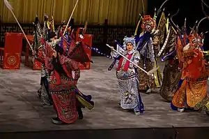Cao Cao's forces pursued Zhao Yun as he retreated back to his camp. Upon seeing the enemy's approach, Zhao Yun's subordinate Zhang Yi wanted to shut the camp's gates and get the troops to hold their position. However, Zhao Yun ordered the gates to be opened, all flags and banners to be hidden, and the war drums to be silenced so as to create an illusion of an empty camp.[44] Cao Cao's forces thought that there was an ambush inside Zhao Yun's camp so they withdrew. Just as they were retreating, Zhao Yun launched a counterattack and his men beat the war drums loudly and fired arrows at the enemy. Cao Cao's soldiers were shocked and thrown into disarray. Some of them trampled on each other as they panicked and fled, while many of them fell into the Han River and drowned.[45]