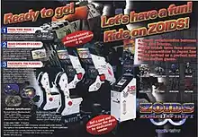 Zoids Infinity is a battle action game using Zoids, which are dinosaur/animal/insect robots developed by Tomy Co., Ltd. Players can choose favorite Zoids based on design, speed and mobility. You can customize your own ZOIDS by using weapons parts and items which you have got. The game allows you to take control of Zoids machines in battle while you collect parts by defeating Zoids. The arcade originally featured 29 Zoids to control. In 2-player mode, the screen is split horizontally where each player views the action from a personal vantage point.