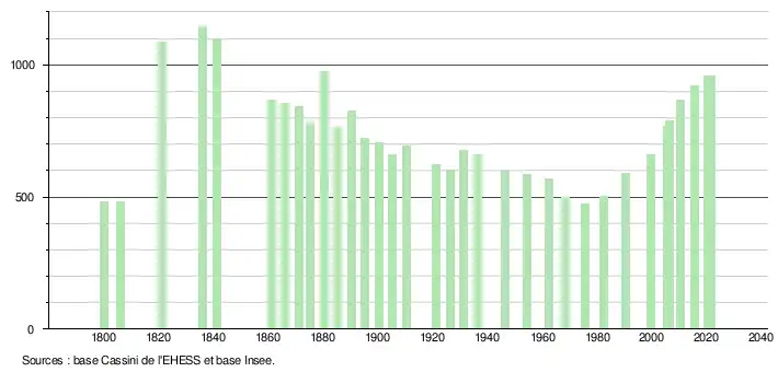 L'évolution du nombre d'habitants est connue à travers les recensements de la population effectués dans la commune depuis 1800. Pour les communes de moins de 10 000 habitants, une enquête de recensement portant sur toute la population est réalisée tous les cinq ans, les populations légales des années intermédiaires étant quant à elles estimées par interpolation ou extrapolation[19]. Pour la commune, le premier recensement exhaustif entrant dans le cadre du nouveau dispositif a été réalisé en 2005[20].