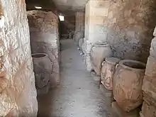 La civilisation mycénienne succède à la civilisation minoenne. La connaissance de l'organisation politique de la société mycénienne est meilleure à l'échelle locale, grâce aux sources administratives en linéaire B provenant des palais de Pylos et de Cnossos, ou encore de Thèbes[9]. Les produits des terres agricoles environnantes ont été collectés, enregistrés et stockés dans les palais, comme en témoignent le grand nombre de magasins et de pithos (pots de stockage) récupérés. La découverte de tablettes en Linéaire A et Linéaire B, répertoriant les produits dans les zones d'archives du Palais de Knossos, suggère une bureaucratie très organisée et un système de tenue de registres qui contrôlait tous les produits entrants et sortants. À Pylos, des archives similaires montrent que le palais prélevait des taxes en nature sur des membres des communautés rurales, sans doute en tant que redevance contre l'attribution de terres palatiales[10]. De plus, la métallurgie est également documentée à Pylos par une série de tablettes qui montre que le palais distribuait du bronze à des forgerons qui devaient ensuite rendre le produit fini.