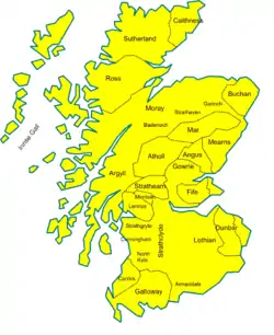 À des fins législatives et administratives, le royaume des Scots est divisé en trois, quatre ou cinq zones : l’Écosse (Scotland-proper) au nord et au sud des Grampians, le Lothian, le Galloway et plus tard le Strathclyde. Tout comme l’Écosse, ni le Lothian ni le Galloway n’ont leur sens actuel. Le Lothian se réfère à toute la région sud-est, dont la langue était le moyen anglais, et inclut plus tard une majeure partie du Strathclyde ; il était séparé de l’Écosse par le fleuve Forth. Le Galloway désigne à l’époque toute la région sud-ouest, et la langue parlée y était le gaélique.