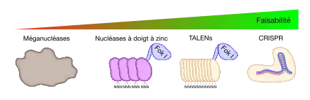 - méganucléases (en anglais : engineered meganuclease re-engineered homing endonucleases) conçues par génie génétique pour reconnaître et cibler des séquences spécifiques du génome ;