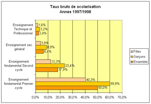 Depuis le début, la scolarisation des filles est moins importante que celle des garçons. En 2002, le taux brut de scolarisation des filles était de 56,7 % contre 77,9 % pour les garçons[19]. Ces inégalités existent à tous les niveaux du système éducatif. Présentes dès l’enseignement fondamental, elles augmentent avec la poursuite des études dans le secondaire.