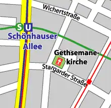 L'église de Gethsémané est située au carrefour de Stargarder Straße et de Greifenhagener Straße, à environ 100 mètres à l'est de la Schönhauser Allee et de la station de métro du même nom. Le bâtiment de l'église est est-ouest, et sa tour occidentale forme une façade décorative sur le carrefour. La rue Gethsemanestraße, qui porte donc le nom de l'église, entoure le chœur à l'est et au nord du bâtiment, formant avec les deux autres rues une sorte de carré autour de l'église. La banlieue nord de Berlin possède maintenant peu de bâtiments prestigieux, de sorte que les bâtiments de l'église fournissent le principal point d'intérêt architectural dans ce secteur.