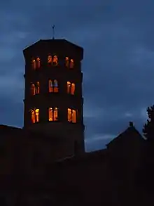 Il est orné aux trois étages supérieurs de baies cintrées géminées séparées par des colonnettes et surmontées de bandes lombardes.
