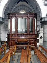 Le buffet est de style Second Empire, les façades sont en noyer massif. L'entablement du soubassement est orné de quatre médaillons représentant Jean-Philippe Rameau, Jean-Sébastien Bach, Georg Friedrich Haendel et Camille Saint-Saëns. Le grand orgue[n 22] et le récit[n 23] sont sur le même plan. Tous les jeux sont en boîte expressive, sauf les tuyaux en façade et le salicional. L'instrument possède 840 tuyaux en étain dont quatre sont polyphones. Il comprend douze jeux, deux claviers de 56 notes, un pédalier de trente, deux tirasses, un accouplement et une pédale d'expression[n 24],[6].