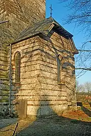 Le chevet, couvert d'une toiture en bâtière à croupette faite d'ardoises, est percé sur chaque face d'une haute fenêtre ogivale à simple ébrasement et aux claveaux de pierre calcaire.
