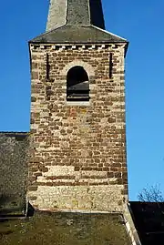 Dominant le chevet, l'église conserve un clocher roman présentant une maçonnerie faite principalement de moellons de grès ferrugineux assemblés en appareil irrégulier et parsemée de blocs de grès blanc, sauf la base qui est uniformément blanche.
