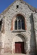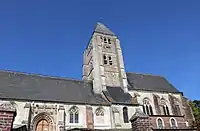 Église du XIIIe siècle ; abside circulaire ; fenêtres ogivales divisées en deux et trois parties, par d'élégantes colonnettes ; porte latérale ornée de sculptures aujourd'hui mutilées. Clocher élevé et percé de meurtrières ; carrelage du chœur d'une rare beauté, provenant de la Chartreuse du Val-Saint-Pierre ; Maître-autel en marbre, avec dôme soutenu par six colonnes au-dessus d'un tabernacle prismatique tournant pouvant présenter trois faces. L'autel est de 1745, et le tabernacle de 1788[6].