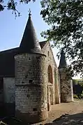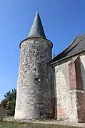 La façade de l'église est flanquée de deux tourelles d'angles circulaires.