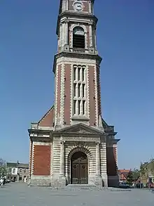 L'église de briques à encorbellements de pierre est de style néo-classique. Son portail est surmonté d'un fronton triangulaire à la grecque. La tour-clocher en façade comprend quatre ordres et mesure 52 mètres de hauteur[2],[3]. Elle est surmontée d'une terrasse à balustrade, balustrade que l'on retrouve sous les deux pans du toit d'ardoises, scandée aussi de pots à feu. Les côtés de l'église sont éclairés de six hautes fenêtres. L'église présente un vaisseau sans transept, flanqué de bas-côtés et terminé par une abside semi-circulaire.