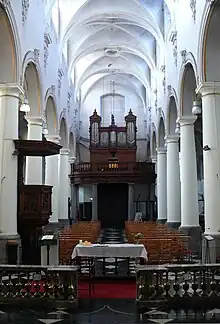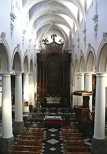 La nef centrale est ponctuée par une enfilade de colonnes toscanes surmontées de grandes arcades en plein cintre largement ouvragées. Des voûtes d’ogives quadripartites séparées de larges arcs doubleaux en plein cintre couvrent cet espace. Un motif végétal indéterminé est réalisé sur chaque croisée d’ogives excepté la croisée d’ogives de la deuxième travée qui possède une clef de voûte annulaire permettant le levage ou la descente des cloches. Chaque voûtain est orné en son centre d’une petite étoile à six branches, tandis que les arcs doubleaux sont moulurés de motifs géométriques et végétaux.