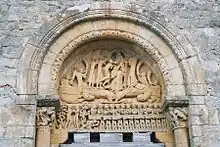 Le tympan représente la scène de l'Épiphanie. La marche des Rois Mages est orchestrée par des anges qui sonnent de l'olifant : les quatre figures ailées pourraient représenter les anges qui retiennent les 4 vents aux 4 coins du monde.