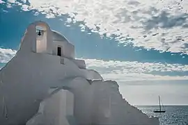 Plus ancienne des 400 églises de Mykonos, l'église de la Panagía Paraportianí est construite entre 1425 et le XVIIe siècle, au bord de la mer Égée, au bout du vieux port du quartier Kástro de la ville de Chóra (capitale de l’île).