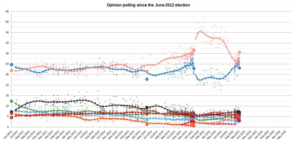 Si le gouvernement espagnol Rajoy soutient le gouvernement Samarás, le parti d'opposition Podemos, favori dans les sondages des élections générales prévues en novembre en Espagne, soutient SYRIZA[28] ; SYRIZA a également en France le soutien du Front de gauche, d'Europe Écologie Les Verts, du Front national[29], de Nouvelle Donne, des socialistes frondeurs, des dirigeants du Nouveau Parti anticapitaliste, des syndicalistes et des altermondialistes[30].