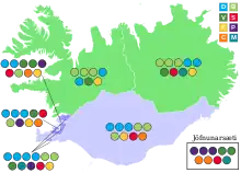 L'Islande est divisée en 6 circonscriptions électorales dont les limites sont définies par la loi : Norðausturkjördæmi (Nord-Est), Norðvesturkjördæmi (Nord-Ouest), Reykjavíkurkjördæmi norður (Reykjavik Nord), Reykjavíkurkjördæmi suður (Reykjavik Sud), Suðurkjördæmi (Sud) et Suðvesturkjördæmi (Sud-Ouest).