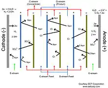 L'appareil qui l'effectue, un électrodialyseur, est composé de nombreux compartiments et de membranes alternativement anioniques et cationiques. Lors de l'action du champ électrique, la membrane anionique permet le passage des anions et la membrane cationique laisse franchir les cations.