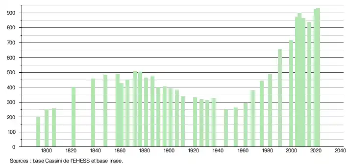L'évolution du nombre d'habitants est connue à travers les recensements de la population effectués dans la commune depuis 1793. Pour les communes de moins de 10 000 habitants, une enquête de recensement portant sur toute la population est réalisée tous les cinq ans, les populations légales des années intermédiaires étant quant à elles estimées par interpolation ou extrapolation[14]. Pour la commune, le premier recensement exhaustif entrant dans le cadre du nouveau dispositif a été réalisé en 2004[15].