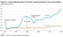 Dix ans après le renversement de Saddam Hussein, la production a dépassé son record historique de 1990 grâce aux prospections de firmes occidentales, russes et asiatiques dans le Sud. Elle a atteint 4,4 Mb/j (millions de barils par jour) en moyenne en 2016, au quatrième rang mondial derrière les États-Unis, la Russie et l'Arabie saoudite, avec des exportations records de 4,1 Mb/j en , alors que la production ne dépassait pas 1,5 Mb/j avant l'invasion de 2003 et même 3,5 Mb/j avant l'invasion du Koweït en 1991[2].