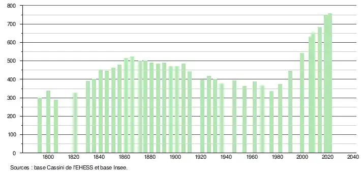 L'évolution du nombre d'habitants est connue à travers les recensements de la population effectués dans la commune depuis 1793. Pour les communes de moins de 10 000 habitants, une enquête de recensement portant sur toute la population est réalisée tous les cinq ans, les populations légales des années intermédiaires étant quant à elles estimées par interpolation ou extrapolation[13]. Pour la commune, le premier recensement exhaustif entrant dans le cadre du nouveau dispositif a été réalisé en 2008[14].