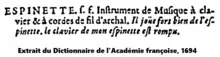 « Le clavecin est une espèce d'espinette dans une autre disposition du clavier. Ce nom a été donné, à cause de ces petites pointes de plumes qui tirent le son des cordes, qui ressemblent à des épines. »