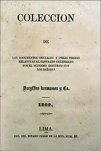 En 1869, l'État péruvien a mis fin au système de consignataire et, malgré les protestations des entrepreneurs nationaux (les «fils du pays»), a cédé l'ensemble de l'entreprise à la maison d'affaires du financier français Auguste Dreyfus par le biais du « contrat Dreyfus » dont l'architecte était le ministre des Finances Nicolás de Piérola. Par ce contrat Dreyfus avait les droits sur toutes les exportations de tous les sites d'exploitation du guano vers les principaux marchés en échange de paiements anticipés à l'État. Un prix de référence et une quantité de guano à exporter par an ont été établis pour savoir combien l'homme d'affaires paierait. Bien que ce contrat ait l'avantage de donner beaucoup d'argent à l'avance à l'économie de l'État, il a l'inconvénient de rendre l'État dépendant d'un opérateur unique. Quand en 1872 le prix du guano sur le marché international commencera à baisser, Dreyfus cessera de payer à l'État les grosses sommes des premières années et quand en 1875 l'homme d'affaires décidera de quitter l'entreprise, l'État se retrouvera privé de revenu du jour au lendemain et la crise sera dramatique.