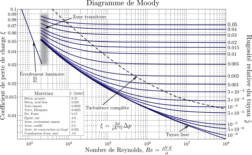 Plusieurs méthodes permettent de définir le coefficient de perte de charge. L'une des plus connues recourt au diagramme de Moody, qui est un abaque permettant de déterminer le coefficient de perte de charge à partir du nombre de Reynolds et de la rugosité () de la conduite. Il est également possible de calculer directement ce paramètre à partir de corrélations qui sont à la base du diagramme du Moody :