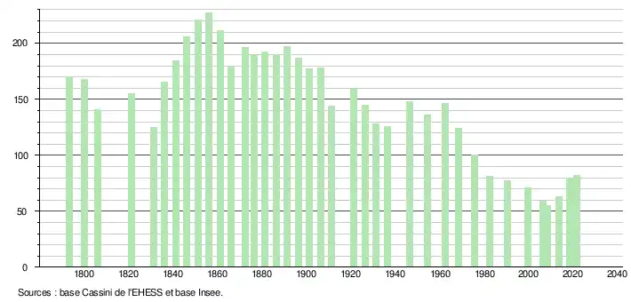 L'évolution du nombre d'habitants est connue à travers les recensements de la population effectués dans la commune depuis 1793. Pour les communes de moins de 10 000 habitants, une enquête de recensement portant sur toute la population est réalisée tous les cinq ans, les populations légales des années intermédiaires étant quant à elles estimées par interpolation ou extrapolation[43]. Pour la commune, le premier recensement exhaustif entrant dans le cadre du nouveau dispositif a été réalisé en 2008[44].