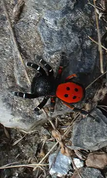Le mâle se reconnaît aisément grâce à son abdomen rouge vif orné de quatre taches rondes et noires[3]. La femelle de cette araignée fouisseuse est presque entièrement noire, à l'exception d'un semis de poils ocrés sur la tête[3].