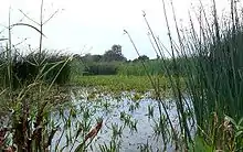 - Les sorties ou pertes d'eau[10] sont celles des exutoires (trop plein), de la percolation vers la nappe (liée à la perméabilité du fond, des berges et du substrat et à la hauteur de l'eau, cf. Loi de Darcy), l'évaporation (E)[11] et l'évapotranspiration (ET)[12],[13] des plantes aquatiques de surface, de la ceinture de végétation et des arbres dont les racines peuvent prélever de l'eau dans l'étang[14]. Il faut aussi parfois tenir compte de conditions particulière de froid/gel déshydratant[15].