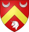 De gueules au chevron d'or, accompagné en chef de 2 croissants d'argent et, en pointe, d'un buste de licorne du même |