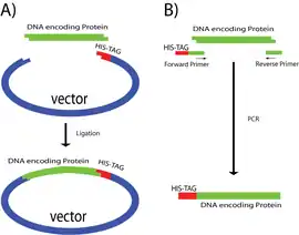 La séquence correspondant à l'étiquette doit être ajoutée après une méthionine au début de la séquence codant la protéine, ou à la fin avant un codon stop. Le choix de l'extrémité dépend de la structure de la protéine d'intérêt, ainsi que de la méthode choisie pour retirer l'étiquette. La plupart des exopeptidases ne peuvent retirer le résidu qu'à l'extrémité N-terminale, d'autres méthodes étant requises pour l'autre extrémité. L'emplacement choisi ne doit bien sûr pas être enfoui au centre de la protéine, ni jouer un rôle important dans sa fonction.