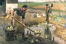 - «... Quelle différence avec l'atmosphère si délicatement nuancée baignant la cour de ferme où se situe la jeune femme aux allures sculpturales que n'aurait pas désavouée un Constantin Meunier. C'est une toile de "plein air". Désormais, c'est en plein air qu'Evariste Carpentier préfèrera peindre et avec une prédilection pour les sujets rustiques dont plusieurs artistes venaient de révéler la poésie. Carpentier a reconnu lui-même avoir particulièrement éprouvé à ce sujet l'influence de Bastien-Lepage, un peintre lorrain, auteur des "Foins" ; mais cette influence n'a-telle pas consisté surtout à raviver en lui le souvenir de sa jeunesse paysanne ? » - Michel Carpentier (fils aîné de l'artiste). Sources : Jacques Goijen, Dictionnaire des peintres de l'École Liégeoise du Paysage. Éditions, 2009