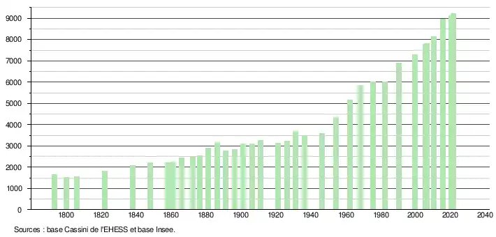 - Population municipale légale en vigueur au 1er janvier 2024, millésimée 2021, définie dans les limites territoriales en vigueur au 1er janvier 2023, date de référence statistique : 1er janvier 2021.