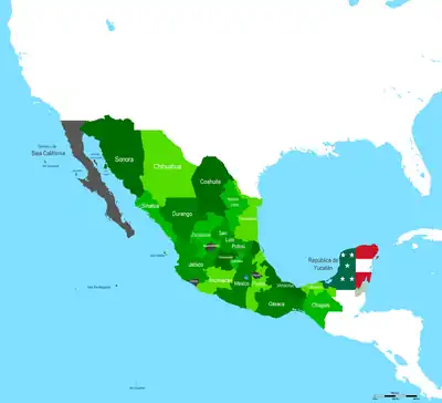 - Subdivisions par départements républicains, le l'organisation territoriale du Mexique est réorganisé par départements sous une république centrale qui portaient les noms de : Coahuila, Tejas, Michoacán, Mexico, Las Californias, Sonora, Chihuahua, Durango, Zacatecas, Jalisco, Guanajuato, Puebla, Oaxaca, Veracruz, Tabasco, Chiapas, Yucatán, Nuevo León, Tamaulipas, Sinaloa, Aguascalientes, Querétaro, San Luis Potosí, Nuevo México.