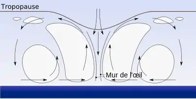 L'œil est constitué par de l'air subsident (mouvement descendant)[1],[3],[4],[5],[Note 1] entouré d'un mur de nuages orageux (cumulonimbus) dans lequel les mouvements ascendants sont rapides. Les températures chaudes de l'œil s'expliquent par la compression adiabatique de l'air subsident. La plupart des sondages effectués dans l'œil montrent que les basses couches restent relativement humides avec une inversion de température au-dessus, ce qui tendrait à démontrer que les couches supérieures d'air subsident de l'œil n'atteignent pas le sol mais restent cantonnées à une altitude de 1 à 3 km de la surface[1].